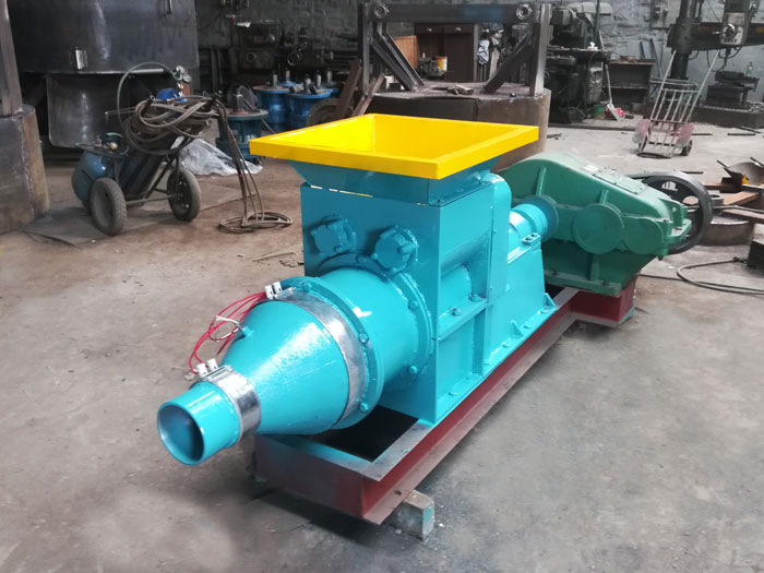 為了解決手工攥制炮泥隨意性大,爆破效果差且效率低的問題,我廠聯合煤礦生產企業(yè)數十次試驗,研發(fā)生產出新型炮泥機,它的主要用途是生產圓柱狀長條形炮泥,供煤礦或冶金礦山等開采爆破作業(yè)中,封閉已裝填好炸藥的炮眼。該機可實現井下作業(yè)制成成品炮泥,工作效率高,且結構簡單,便于操作。同時還可以根據需要,更換炮泥擠出口的直徑,制作出現場生產所需的不同直徑規(guī)格的炮泥,具有適應性強、效率高、炮泥成型好、對炮眼封堵效果好等優(yōu)點,可廣泛應用于井上、下爆破過程中成品炮泥的加工制作。
